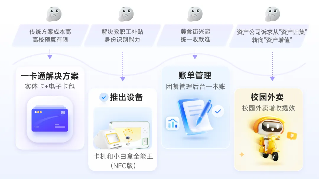 高校食堂怎样才能在有限的预算内减少餐补浪费?校内美食街收款对账繁杂的问题又该如何解决?传统解决方案设备繁多、成本高昂,还无法满足多元需求,让原本就紧张的高校预算压力倍增。
